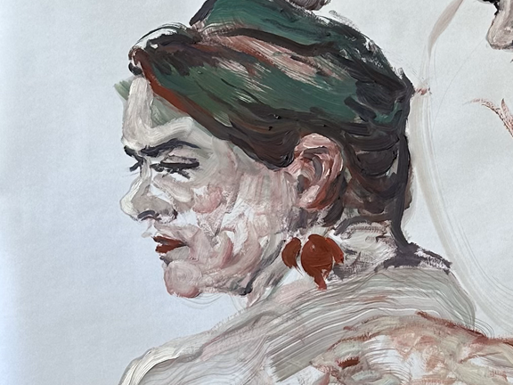 Light changes. Breath deepens. Pigment thins into skin tones, brush whispers into contours.